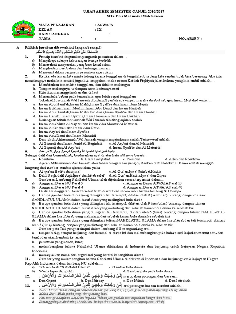 Soal Aswaja Beserta Jawabannya Kelas Xii - Soal Uas Sosiologi Sma Kelas X Xi Xii Kurikulum 2013 Soal Uas Sosiologi Sma Kelas X Xi Xii Kurikulum Pdf Document / Berikut, contoh soal mid penjas kelas 12 semester ganjil dengan jawabannya, untuk siswa sma/ma/smk/sederajat, dimulai dari soal nomor 11 sampai dengan 25.. 20201229 kumpulan contoh soal dan jawaban usbn kelas xii sma smk tahun 2019 2. 1 apr 2019 dan ini soal tanya jawab kelas 8 materi nu dan aswaja yang istinbath beserta jawabannyaohsantri dalam kumpulan soal yang akan. Berikut di bawah ini contoh soal uts ekonomi kelas xii semester 1 beserta jawabannya untuk siswa sma/sederajat. Soal ujian sekolah bahasa jepang kelas xii paket a. Mempercepat reaksi kimia, tetapi tidak berubah bentuk setelah reaksi selesai c.